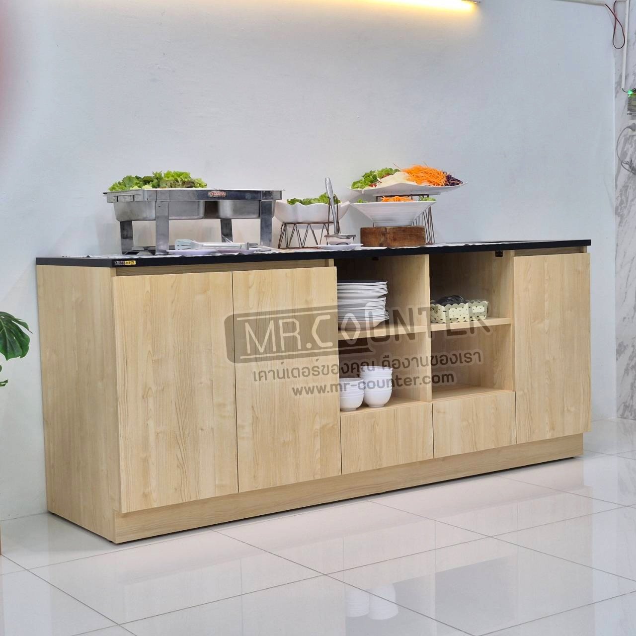 เคาน์เตอร์วางอาหาร ในห้องอาหาร โรงแรม หรือ ในร้านอาหาร มีช่องวางจาน และมีบานตู้เพื่อเก็บของให้เป็นระเบียบ หน้าท็อปมีเจาะช่องทิ้งขยะเล็กๆน้อยๆ