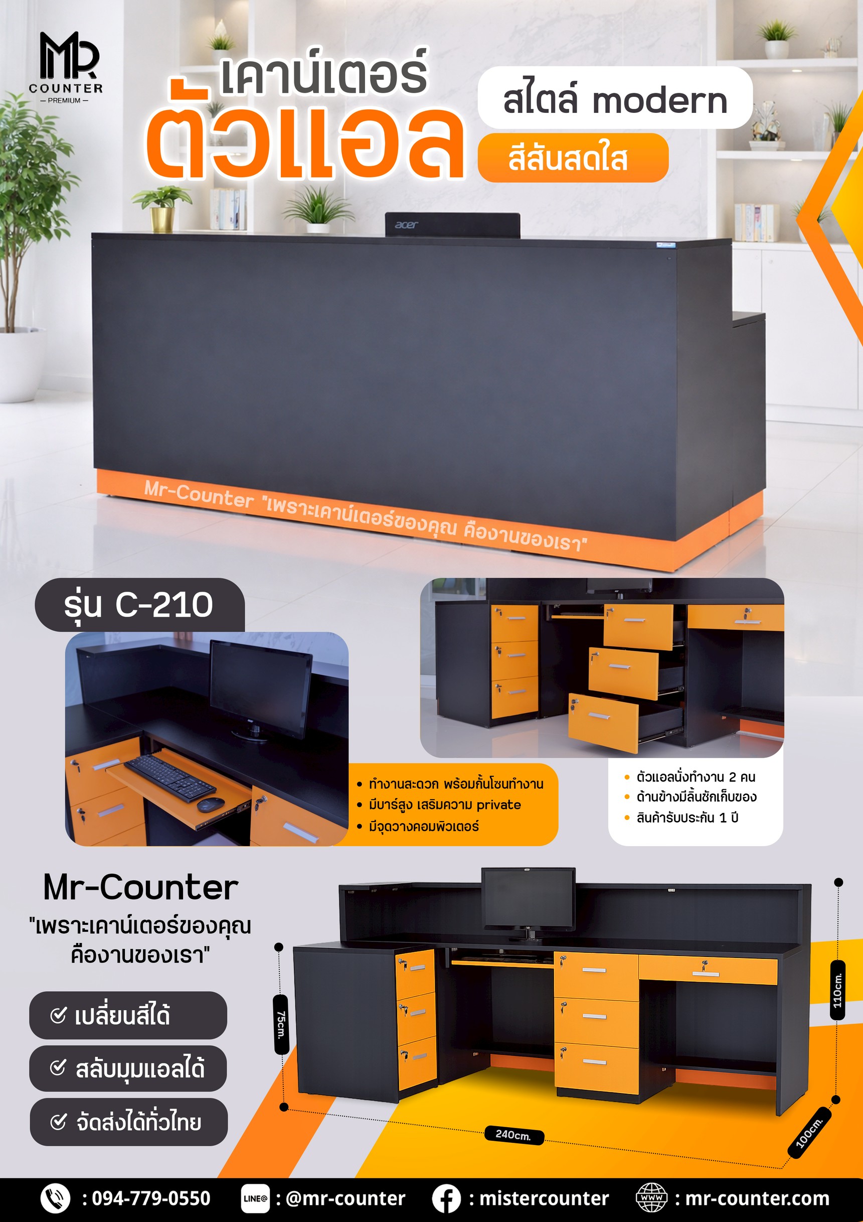 เคาน์เตอร์ C-210 ถูกออกแบบมาเพื่อสร้างภาพลักษณ์ที่ ดูแข็งแรง ทันสมัย และโดดเด่น เหมาะกับธุรกิจที่ต้องการความรู้สึก พรีเมียม ดุดัน และมีเอกลักษณ์